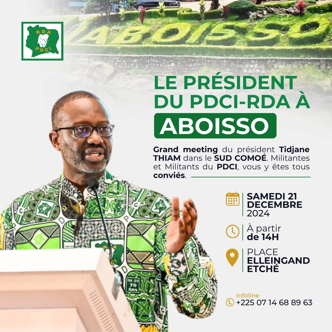 Militantes et militants du PDCI-RDA, le président Tidjane Thiam vous donne rendez-vous pour un grand meeting dans le Sud Comoé. Venez nombreux partager cette grande mobilisation pour l’avenir de notre pays. 🇨🇮